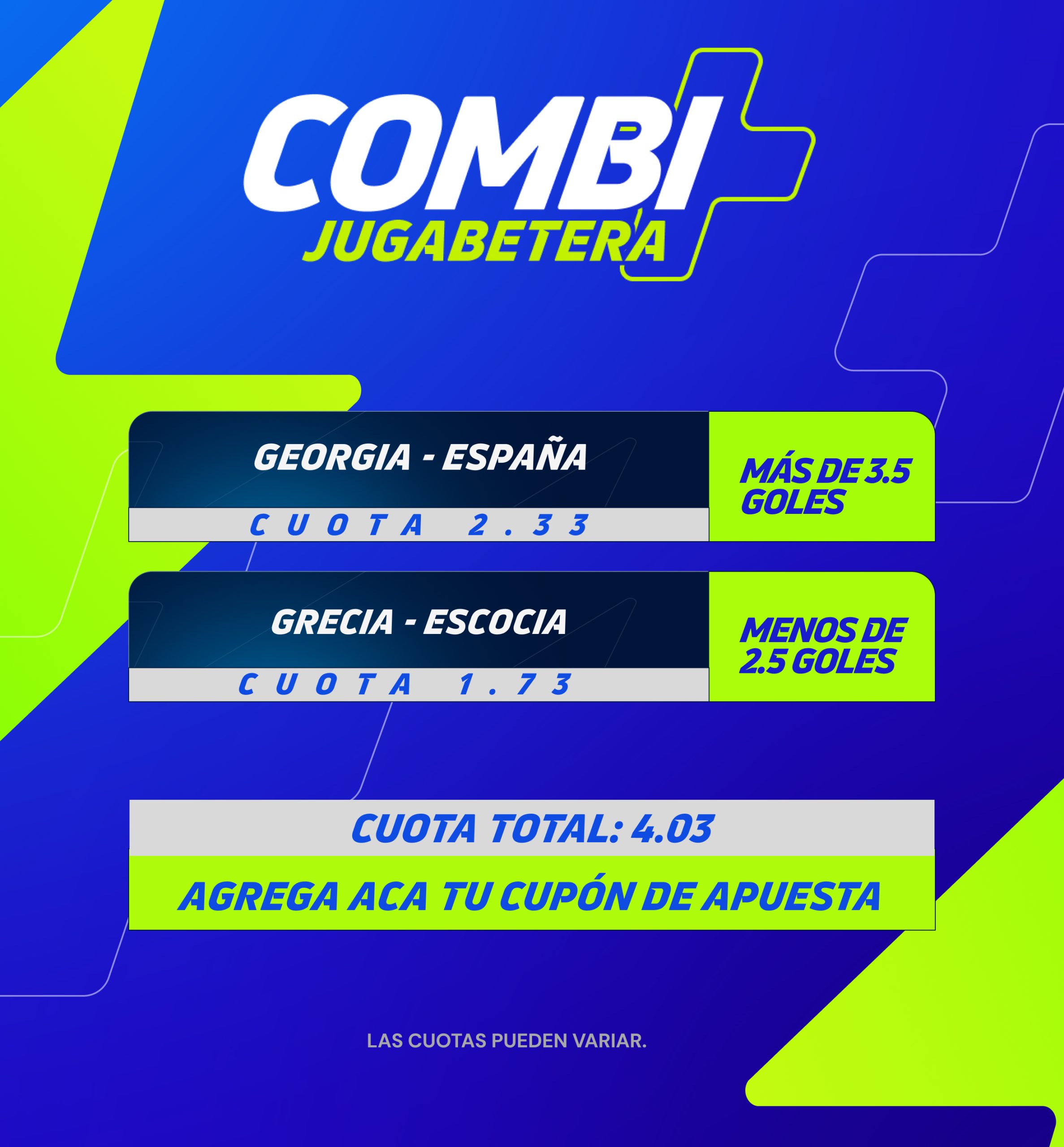 Todos los viernes repasá las combis Jugabeteras, varias opciones de combinadas que te recomienda Jugabet y que podés agregar a tu cupón de apuesta con un solo clic. Vas a ver que las Combis podrán variar de deporte, de mercados y más pero lo que no cambia es el por qué te la recomendamos. Acá nuestras opciones en el momento:
