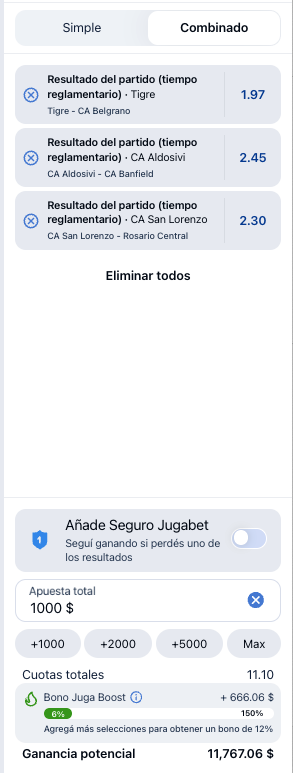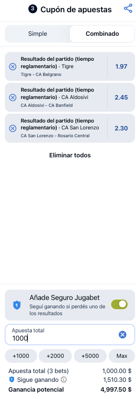 Seguro Jugabet es una herramienta exclusiva que te ofrece Jugabet para apuestas combinadas en las que si una de tus selecciones no ocurre, igual podrás cobrar un porcentaje de tu apuesta. Es importante que tengás en cuenta que el monto de ganancia será distinto. Sin embargo, si todas tus selecciones son ganadoras, igual cobrás todas tus ganancias potenciales.